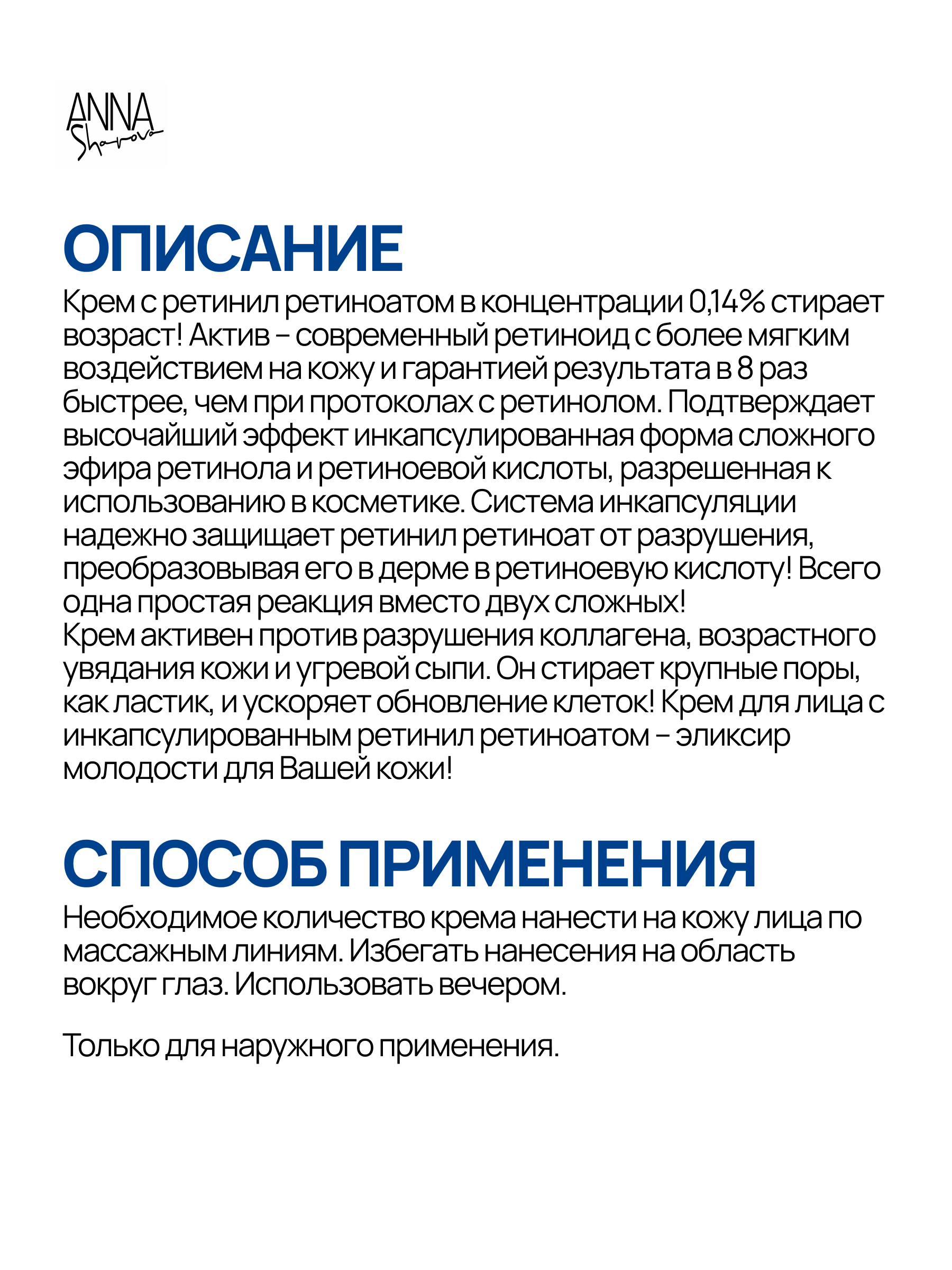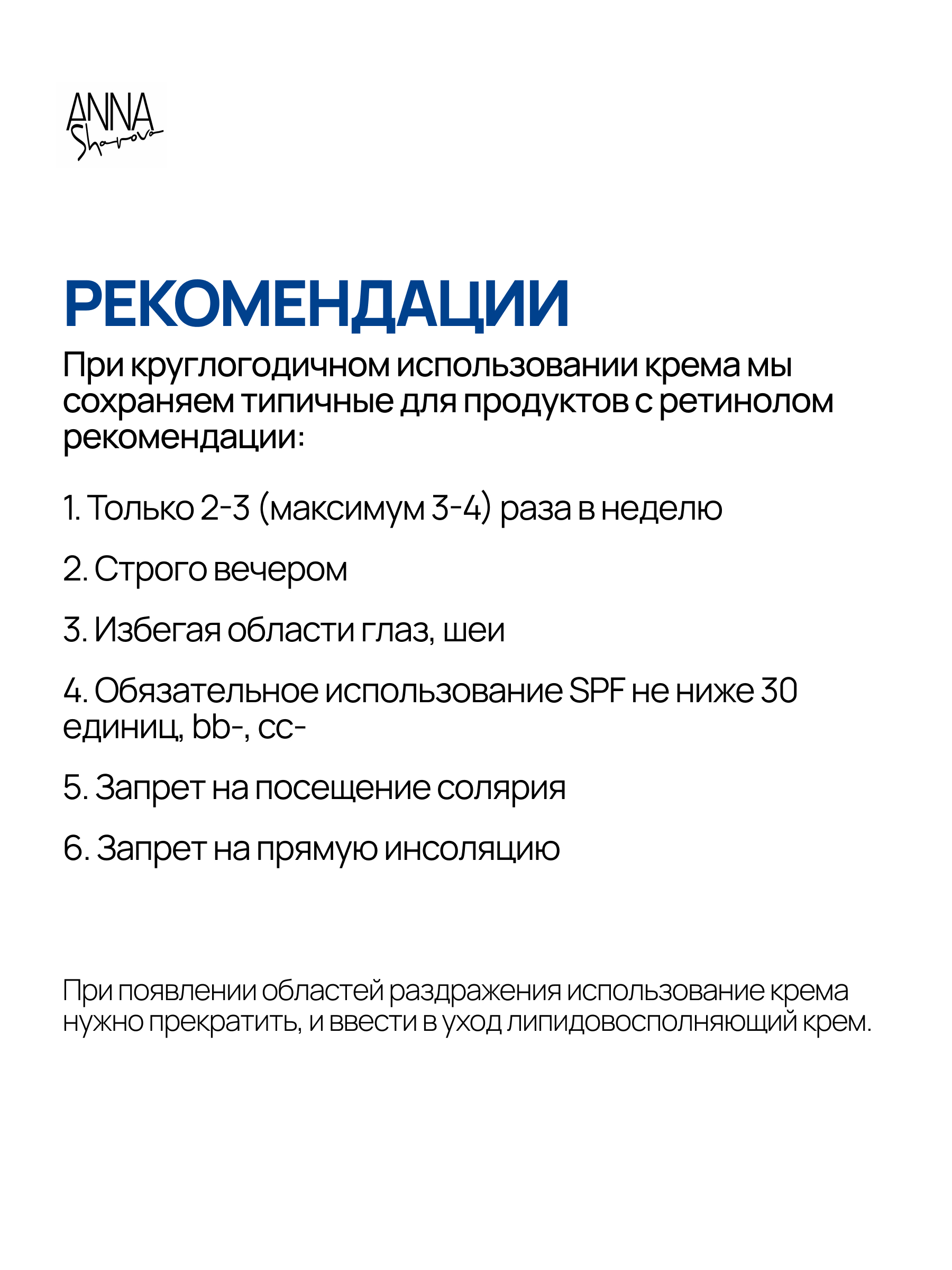При использовании крема с ретинил ретиноатом мы сохраняем типичные для продуктов с ретинолом рекомендации: