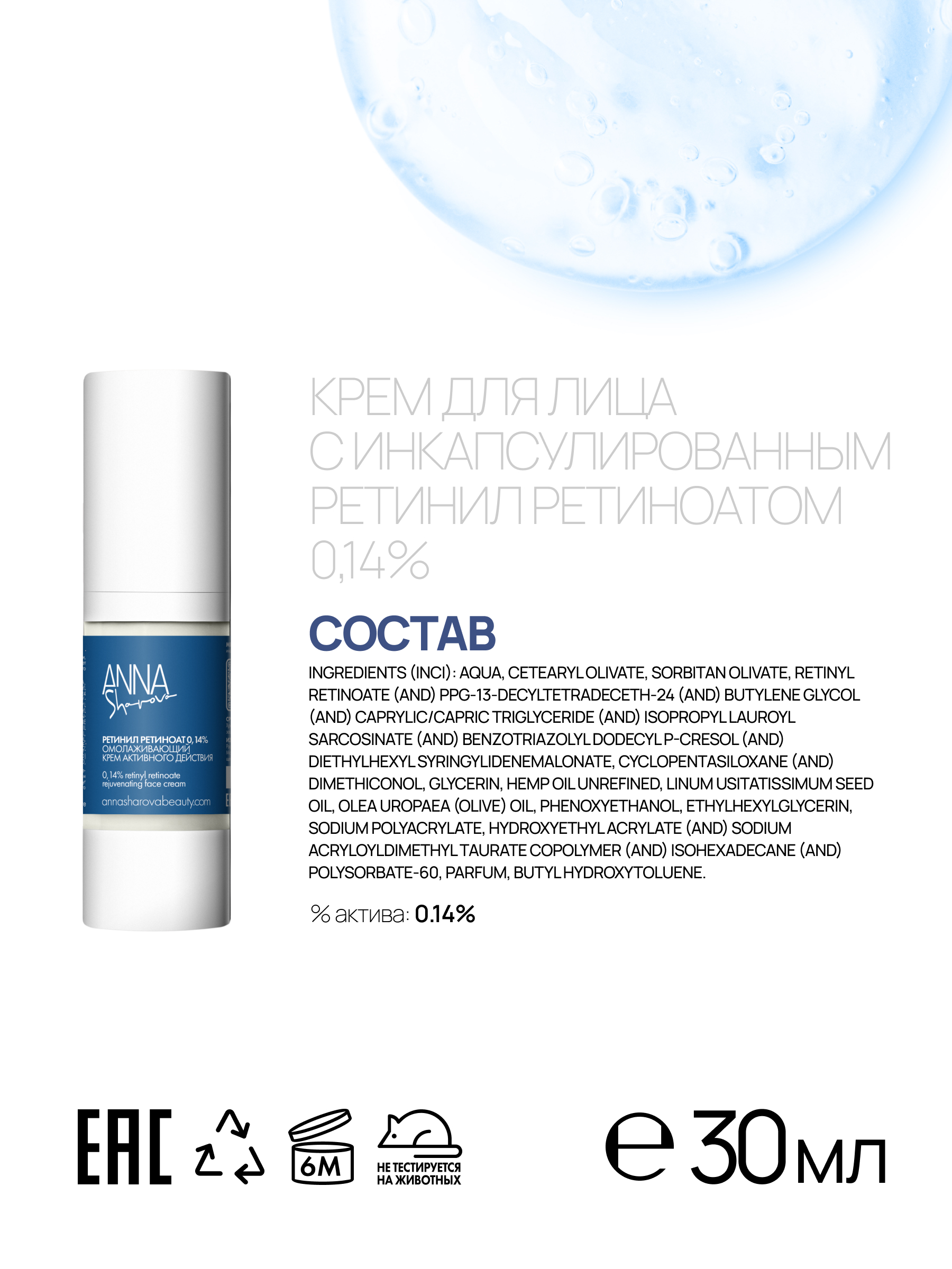 Подтверждает высочайший эффект инкапсулированная форма сложного эфира ретинола и ретиноевой кислоты, разрешенная к использованию в косметике. Система инкапсуляции надежно защищает ретинил ретиноат от разрушения, преобразовывая его в дерме в ретиноевую кислоту! Всего одна простая реакция вместо двух сложных!