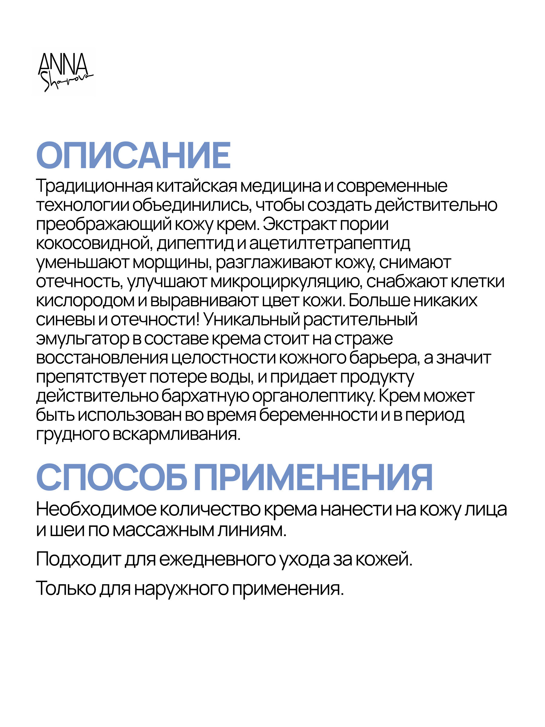 Необходимое количество крема нанести на кожу лица и шеи по массажным линиям. Подходит для ежедневного ухода за кожей. Только для наружного применения.