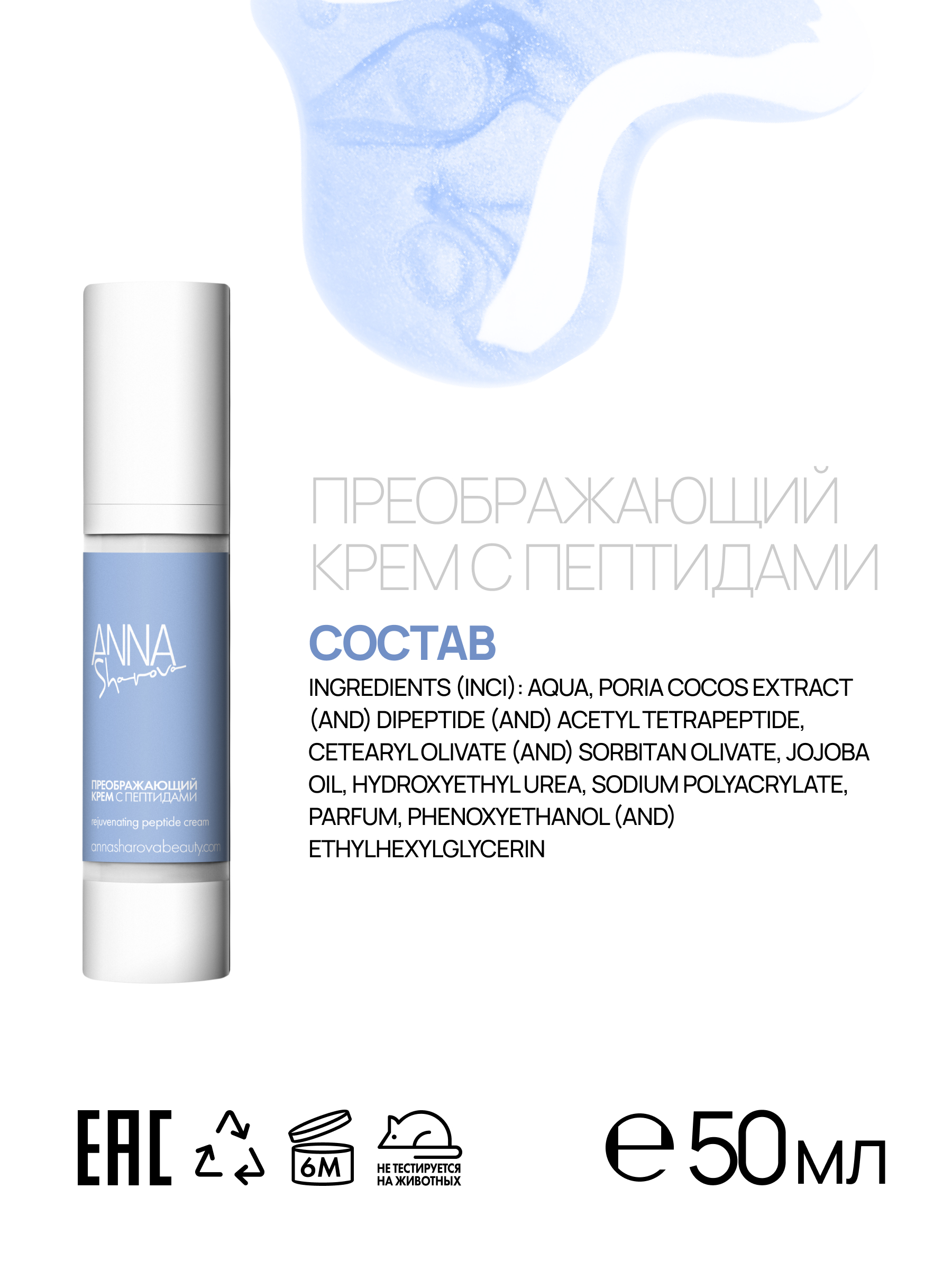 INGREDIENTS (INCI): AQUA, PORIA COCOS EXTRACT (AND) DIPEPTIDE (AND) ACETYL TETRAPEPTIDE, CETEARYL OLIVATE (AND) SORBITAN OLIVATE, JOJOBA OIL, HYDROXYETHYL UREA, SODIUM POLYACRYLATE, PARFUM, PHENOXYETHANOL (AND) ETHYLHEXYLGLYCERIN