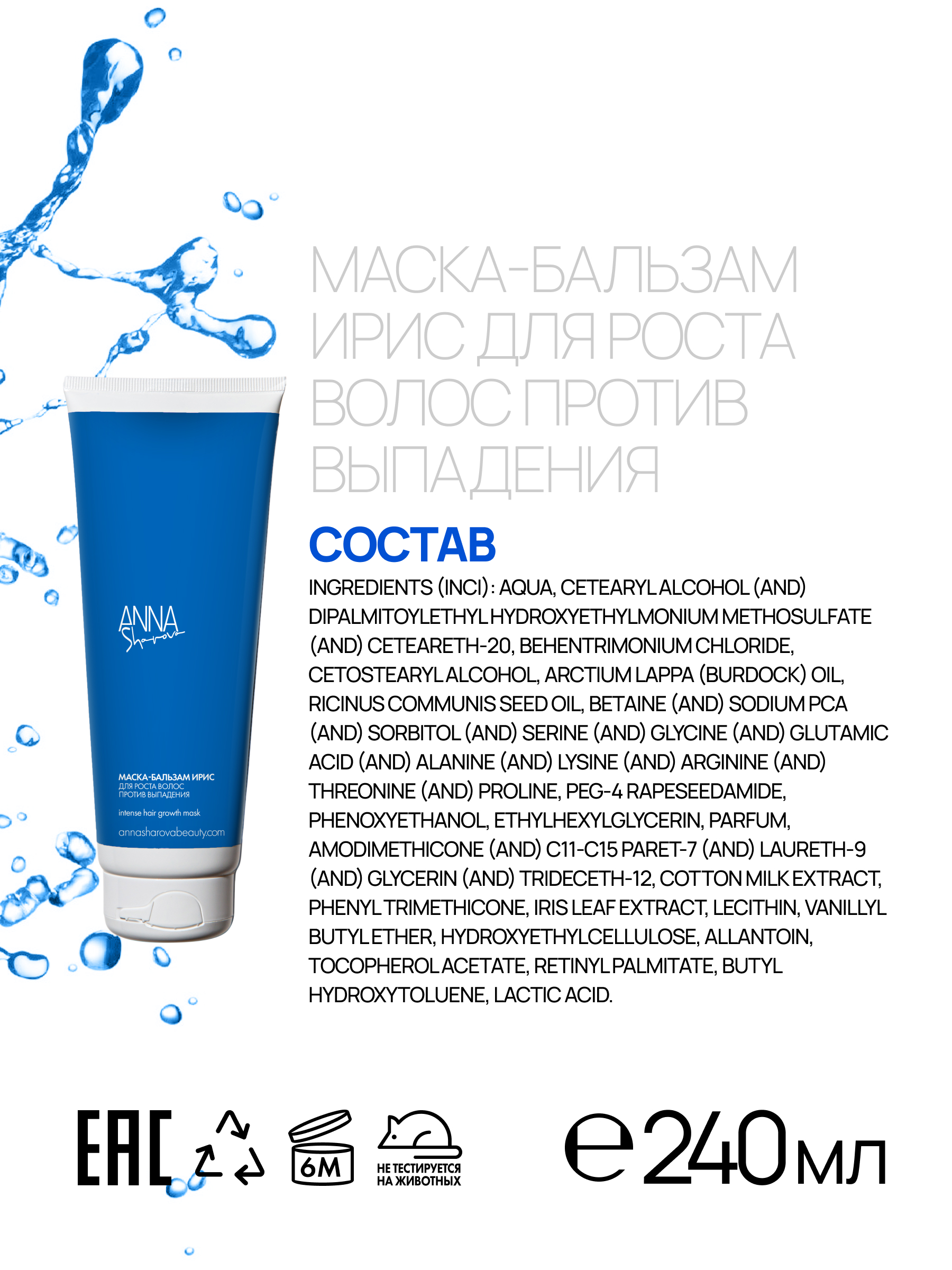 В сердце формулы маски-бальзама с ароматом парфюмированного Ириса - эфир ванили, который активно стимулирует рост волос и уменьшает их выпадение. Основные свойства эфира ванили: усиление кровообращения, обеспечение быстрой доставки питательных веществ к луковице, жизненно необходимых для нормального роста волос, уменьшение воспалительных процессов, запускаемых дигидротестостероном, улучшение процесса роста волос.