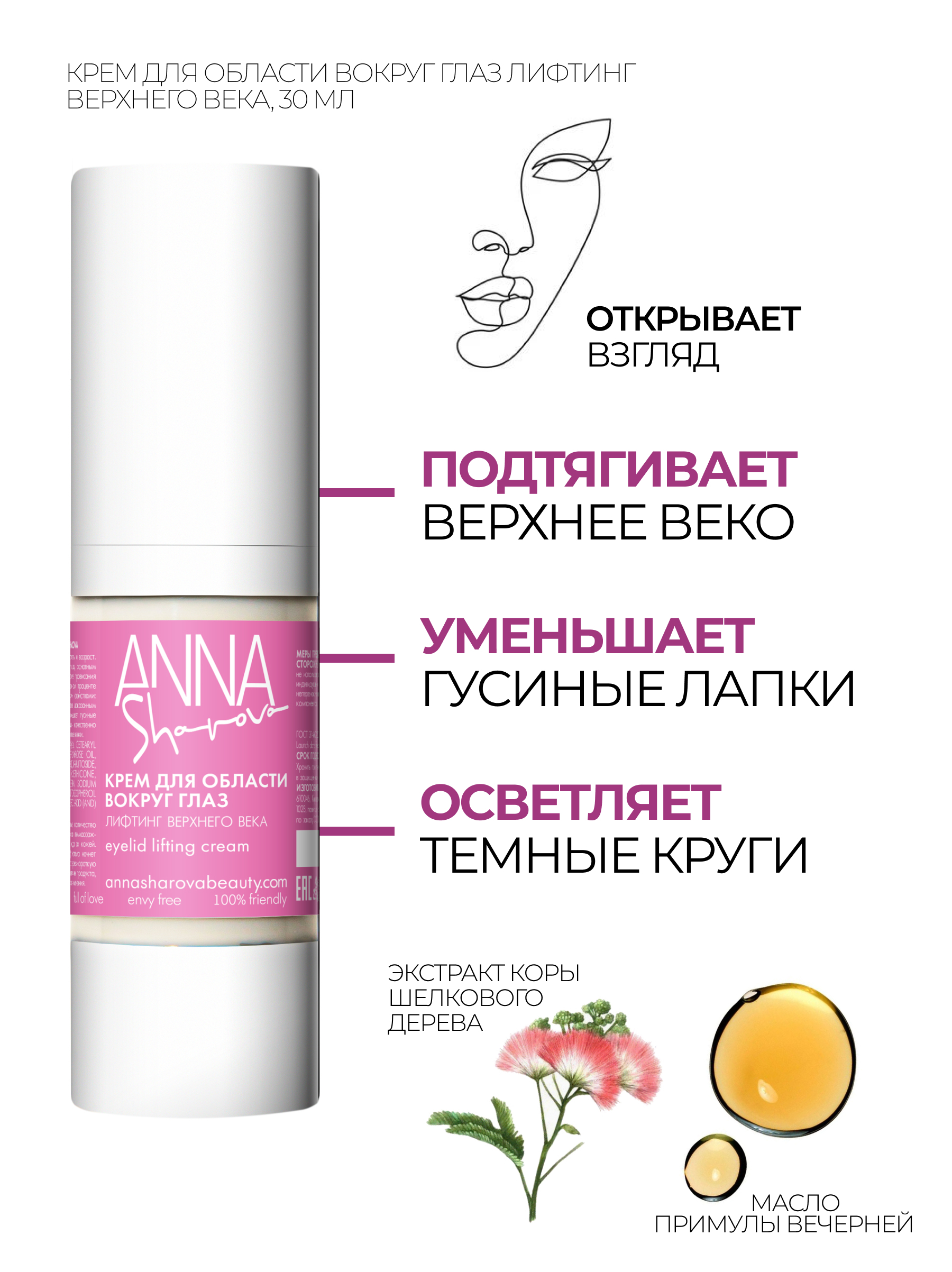 Нависающие веки добавляют взгляду усталость и возраст. Представляем крем для области вокруг глаз, основным активом которого является ингредиент против провисания верхнего века в максимально рекомендованном проценте ввода. Состав обладает сразу несколькими свойствами: подтягивает верхнее веко, то есть обладает доказанным эффектом лифтинга, «открывает» взгляд, уменьшает гусиные лапки, осветляет темные круги под глазами и качественно преображает внешний вид самых нежных участков кожи.