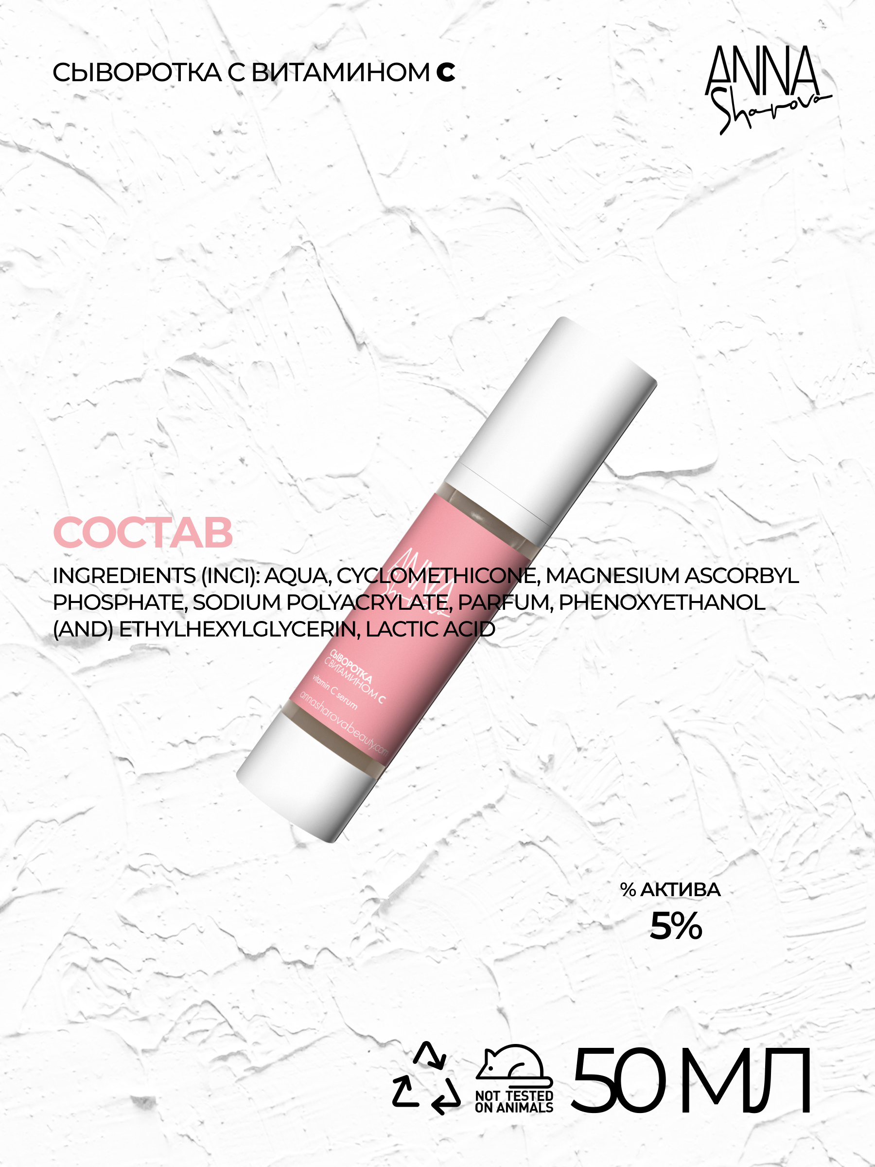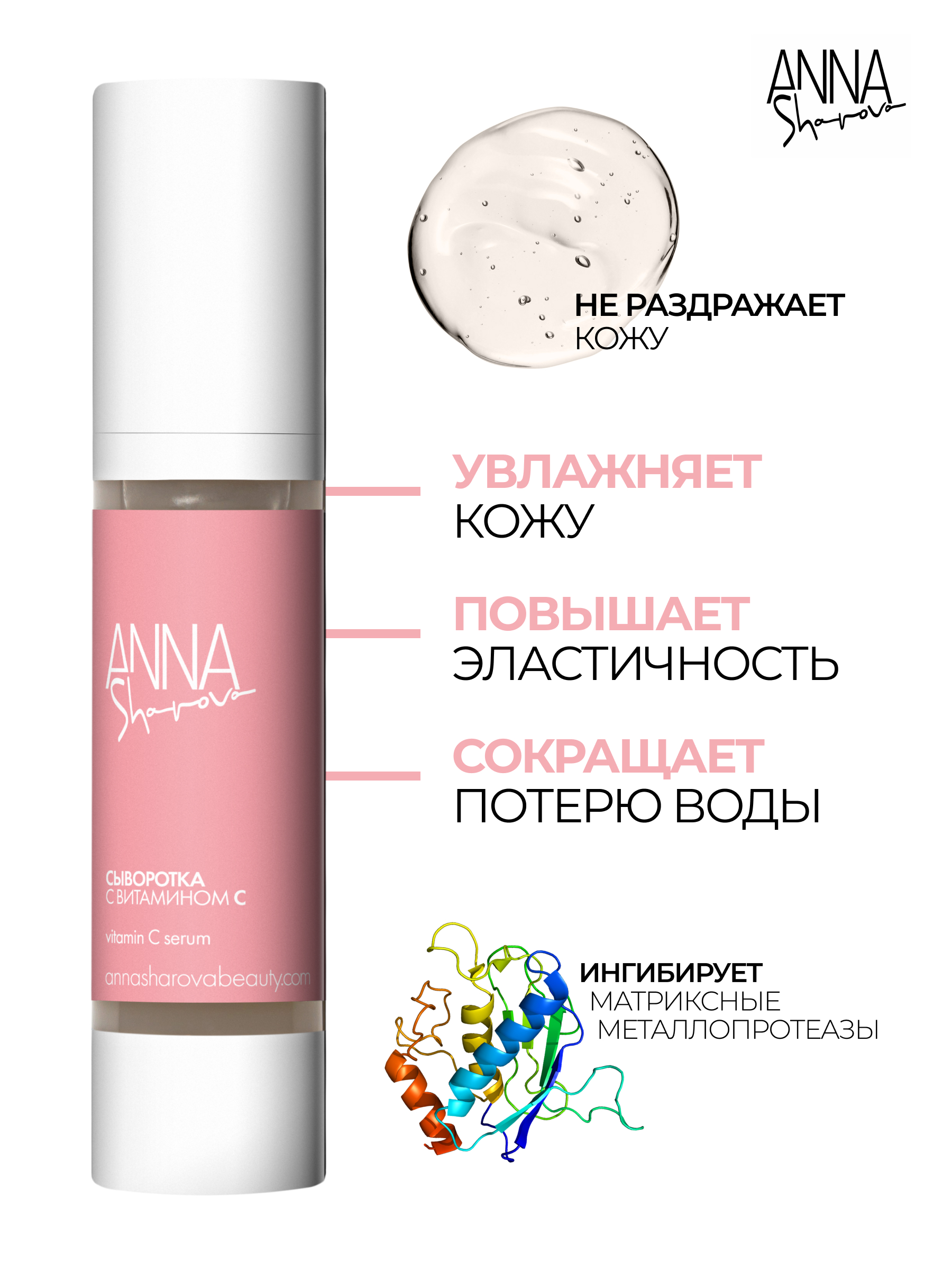 Сыворотка прекрасно увлажняет, повышает эластичность, сокращает потерю воды. А главное, витамин С является известным ингибитором матриксных металлопротеаз, разрушающих коллаген и эластин в коже. А значит сыворотка является прекрасным антивозрастным продуктом, стоящим на страже молодости и красоты.